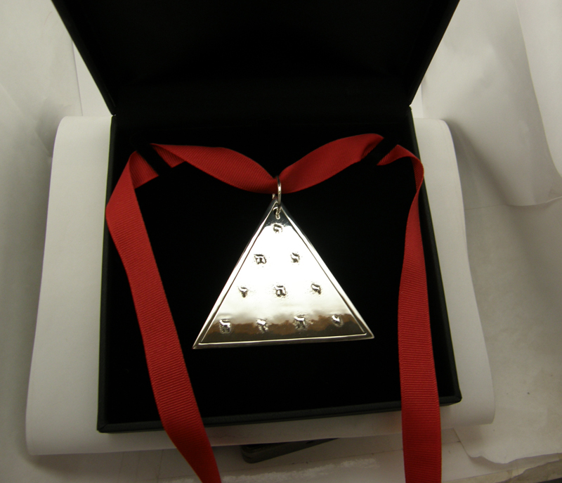 A special jewel with the Tetractys  on one side and the Tetragrammaton on the other. Large, 3.5" each equalateral triangle side, 1/8" thick. Now with a high quality red Grosgrain ribbon.