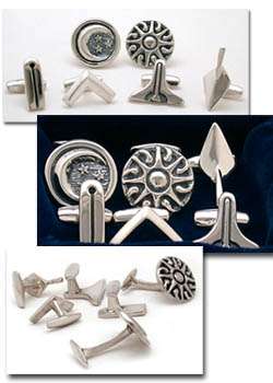 Created in solid Sterling Silver with black antique. The set has specially designed solid shirt stud pegs on the back and a custom cufflink design, for "french style" long cuffs, which is also solid. The shapes of both of these fixtures are designed to sit properly in the buttonhole on the breast or the sleeve, and not to have any moving parts, so they should last a long time.